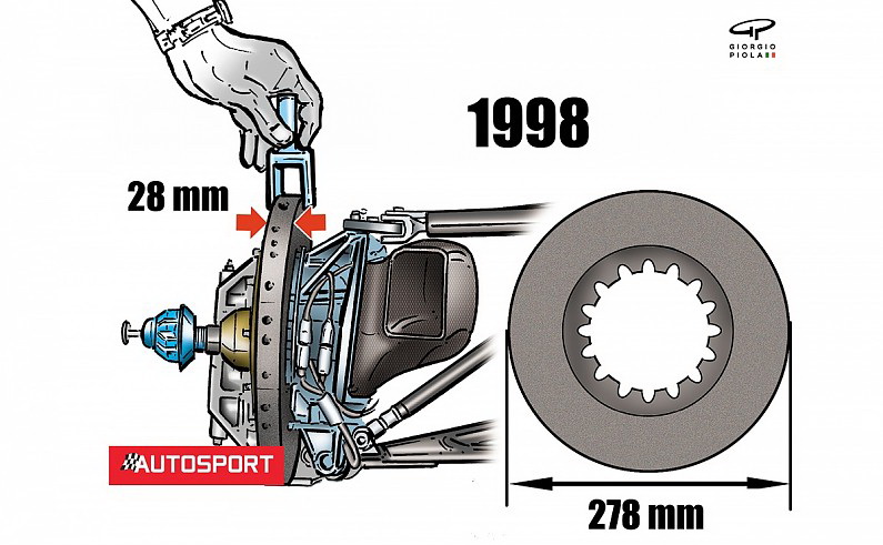 Em 1998, a FIA (Federação Internacional do Automóvel) introduziu regras que alteraram o sistema de freio, determinando pinças de no máximo 6 pistões e não mais que duas pastilhas. O diâmetro máximo do disco do freio passou a ser 278 mm, com espessura máxima de 28 mm.