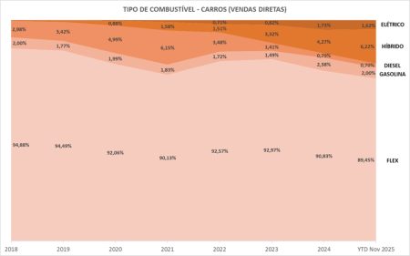 Esses movimentos externos e internos desdobram-se em consequências práticas, que o gráfico abaixo demonstra: a eletrificação saltou de uma fatia quase simbólica (0,19%) em 2018 para 13,46% no acumulado deste ano, reflexo da oferta chinesa e dos híbridos já produzidos localmente. Entretanto importante frisar que o impacto sobre o bolso do comprador médio não é imediato pois as reduções tarifárias, incentivos e maior concorrência costumam reduzir preços de lista, não traduzem em uma queda linear no custo final.