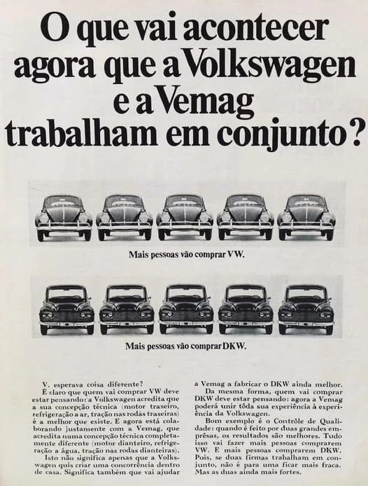 Para completar o raciocínio, vale lembrar que essa não foi a primeira vez que a Volkswagen recorreu a esse tipo de discurso no Brasil. O anúncio da parceria entre Volkswagen e Vemag, que prometia que mais pessoas comprariam Volkswagen e mais pessoas comprariam DKW, usava a imagem da convivência e da soma de forças como argumento central. O que ele não mostrava era o desfecho.
