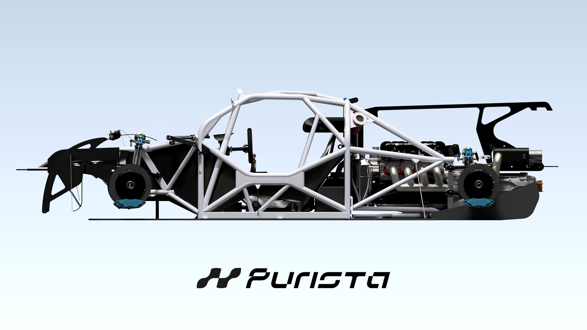 A leitura das imagens técnicas divulgadas pela Purista revela um projeto que parte de fundamentos bastante sólidos. O chassi tubular em aço apresenta uma triangulação bem resolvida, com caminhos de carga definidos e uma clara preocupação com rigidez torcional aliada a controle de peso. Esse tipo de estrutura, quando bem executado, permite não apenas redução de peso, mas também maior liberdade na definição de pontos de suspensão e distribuição de peso. A adoção de um motor aspirado em posição central-traseira reforça esse compromisso com dinâmica, ao reduzir o momento polar de inércia e favorecer respostas mais rápidas em mudanças de direção. “Todo o conjunto foi pensado para ser leve, direto e muito comunicativo”, resume Sánchez, sintetizando uma escolha de arquitetura que privilegia comportamento dinâmico em detrimento de soluções mais orientadas a conforto ou refinamento. Embora ainda não tenha definido qual será, o motor terá configuração de quatro cilindros em linha com potência suficiente para alcançar a proporção de 2,5 kg/cv, território de supercarros como o Ferrari 458 Itália, BAC Mono, Lamborghini Revuelto e McLaren 720S.