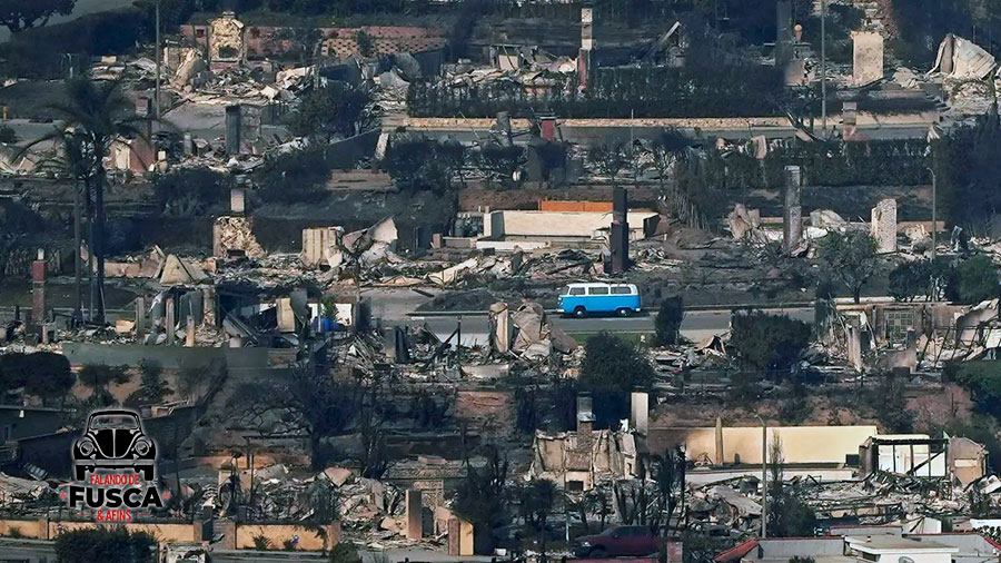 Em meio ao cenário desolador deixado pelo incêndio — casas reduzidas a escombros, estruturas retorcidas, árvores queimadas — um Kombi azul e branco aparece solitário, ainda de pé, cercado por ruínas. A foto, feita por um fotógrafo da agência Associated Press, ganhou o mundo em poucas horas.
