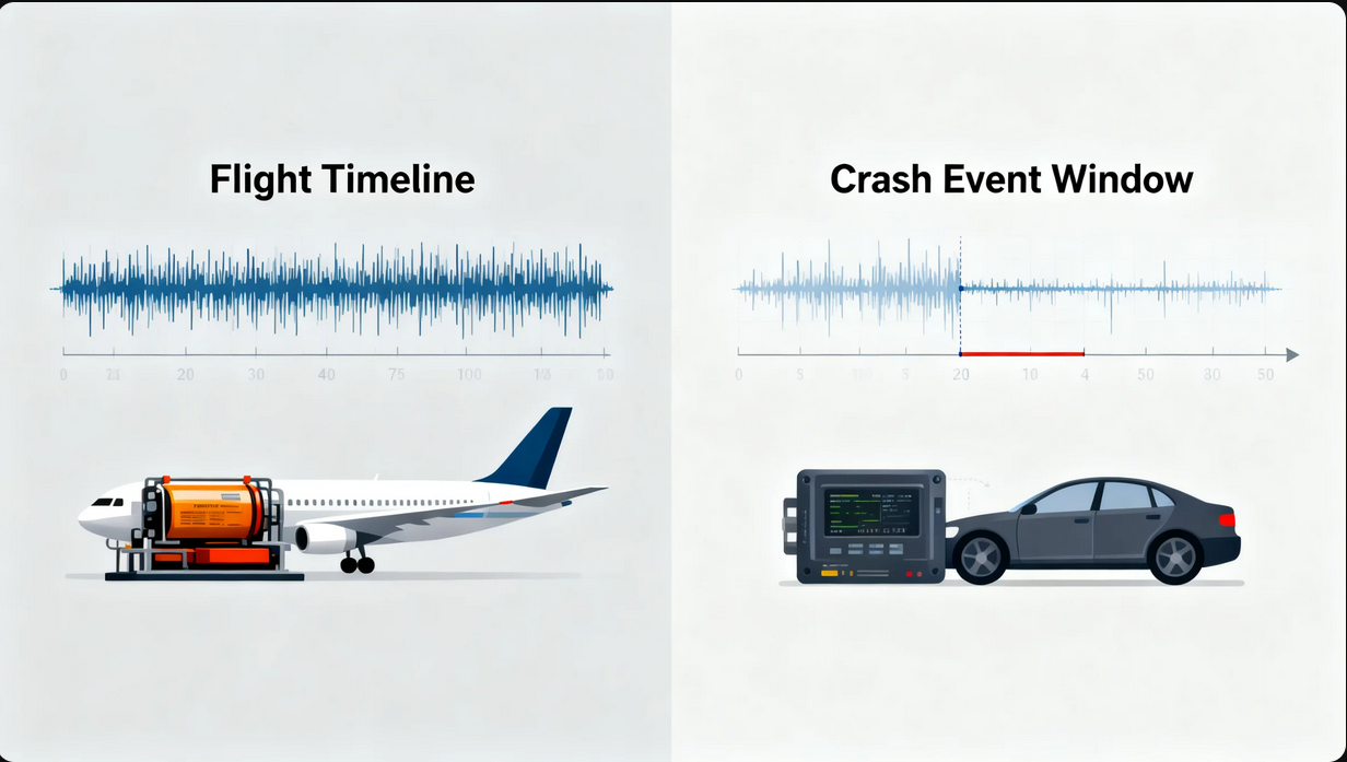 Assim, verificou-se que os dados realmente necessários abrangiam uma faixa de tempo bastante restrita em torno do evento do acidente. O importante era uma faixa de alguns segundos antes e depois do evento. É isso que o EDR realmente registra.